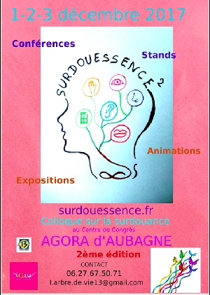 LA SURDOUANCE ET L'HYPERSENSIBILITE Groupes de paroles, expositions, dédicaces... Avec la participation de SMAÏN, la MENSA, COGITO'Z, Ema PEREY, Christel PETITCOLLIN, Kenza RADI... Centre de Congrès AGORA Avenue des Paluds Z.I. des Paluds 13400 AUBAGNE La partie salon est gratuite - Les conférences du colloque sont payantes, 30€ la journée / 50€ le pass pour tout le week-end (Gratuit pour les moins de 15 ans ). Ouverture du Salon : Vendredi 18h30 ( Cocktail de bienvenue ) - Samedi 8h30 - Dimanche 9h00 SURDOUESSENCE met en lumière la dynamique qui est en train de s'installer autour de la neurodiversité, de la multipotentialité, de la précocité, du Haut-Potentiel (HP) et de l'hypersensibilité trop souvent étouffée par nos modes de vie. Ceux qui osent s’affirmer dans leur singularité ou ont un fonctionnement différent se retrouvent en notre société dans une situation d’inadaptés qui doivent alors souvent ou se maquiller pour rentrer dans le moule ou adopter l’attitude de qui serait frappé d’un handicap les marginalisant. Nous n’avons pas à accepter cette situation, et c’est au contraire en se revalorisant et en s’affirmant dans nos différences que nous pouvons cheminer vers notre bonheur et vers l’harmonie collective, révélant les couleurs de la vie. Pour se rendre à l'Agora par les transports en commun : - Depuis la gare SNCF d'Aubagne, prendre le bus de l'Agglo gratuit - ligne 1 (en direction de Les Paluds ou Quartier de Jouques), descendre à l'arrêt Agora. La ligne 1 ne circule pas le dimanche, ce jour-là il faut alors prendre depuis la gare la ligne 11 en direction de Cuges-les-Pins, arrêt Agora. - Depuis le centre-ville de Marseille (place Castellane - à 3 stations de métro de la gare SNCF Saint-Charles par la ligne 2 de couleur rouge), prendre la ligne 102 en direction d'Aubagne - Les Paluds, descendre à l'arrêt ZI Paluds-Agora. - Depuis Cassis, prendre la ligne 68 en direction d'Aubagne-Pôle d'échanges, descendre à l'arrêt Aubagne-ZI Paluds Agora. |