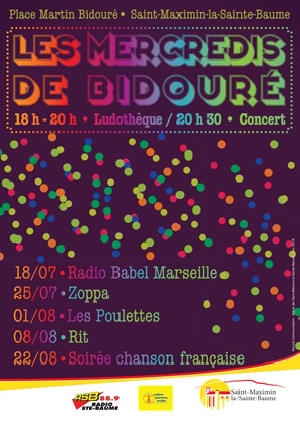 Soirée chanson française – 22 août La chanson qui vient du Sud avec : Mathieu Pirro le Brel provençal ; Christian Vives un De Palmas perdu dans nos garrigues ; Benoît Vauzel la gouaille d'un Ferré, la guitare de Brassens. ************************************************* Les jardins de l'Enclos Saint Maximin la Sainte Baume (83470) 21h30 Service culturel : 04 94 72 58 85 ************************************** Concert 'WoodstockSpirit' 27 juillet ![]() Woodstock Spirit' est un grand show autour des titres célèbres folk, pop, rock des années 60 et début 70 créés aux USA et en Angleterre : Bob Dylan, The Beach Boys, The Who, Jimi Hendrix, The Doors, The Beatles, Pink Floyd, The Rolling Stones, Crosby, Stills, Nash & Young, Simon & Garfunkel, Led Zeppelin... Une atmosphère de souvenirs et de partage, une ambiance conviviale, un moment de musique autour d'un répertoire ancré en chacun de nous ! L'expression et l'apogée mythique de ce mouvement de la jeunesse du baby-boom se trouvent cristallisées à tout jamais à l'occasion du concert de Woodstock en août 1969 dans la banlieue de New-York. Woodstock Spirit' est riche en couleurs, riche en émotions hippie, mods, flower power, psychédélique, rock, folk : toute une période musicale ô combien prolifique ! Stéphane Reusser (chanteur bassiste), Amandine Griffol (chanteuse), Yannick Guérin (chanteur guitariste), Thierry Cartier (guitariste chanteur), Laurent Garcin (guitariste), Jérémy Pézard (batteur), Rodolphe Tourret (pianiste clavier). Concert 'Téléphomme' ![]() Téléphomme, quatre musiciens d'horizons différents réunis autour d'un même but : célébrer les heures de gloire du plus grand groupe de rock français des années 80,Téléphone. De La Bombe humaine à New-York avec toi en passant par les incontournables Cendrillon et Ça, c'est vraiment toi . L'esprit rock et l'énergie de Téléphomme vous emmèneront assurément dans Un autre monde, le temps du spectacle. Julien Bonnemain - Chant et guitare rythmique Phil Lag - Guitare lead et choeurs Henri Deprez - Basse et choeurs Jérémy Gilson - Batterie Génération Hallyday - 17 août Génération Hallyday, c'est avant tout un hommage, une révérence à l'idole du rock français, Johnny Hallyday. Le Choeur du Sud - 24 août Pour la deuxième année consécutive, Le Chœur du Sud a participé à la tournée Var Matin, avec chaque soir des milliers de spectateurs. Gratuit - 21h30 - Jardin de l'enclos |